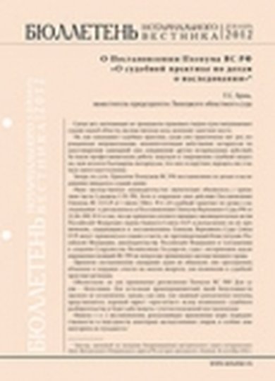 Бюллетень «Нотариального вестника» — бесплатное приложение к научно-практическому журналу «Нотариальный вестник»В Бюллетене «Нотариального вестника» публикуются материалы семинаров и конференций, судебная практика, методическая информация.Издание имеет сквозную нумерацию страниц для удобства ведения подшивки. В текущем номере:Г.С. Брик. О Постановлении Пленума ВС РФ «О судебной практике по делам о наследовании»С.Ю. Чашкова. К вопрос у об отказе от наследства в свете положений Постановления Пленума ВС РФ от 29.05.2012 г. № 9 «О судебной практике по делам о наследовании»